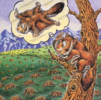 あれ?この森で彼女と待ち合わせしてたんだけど・・・。ホント、たしか昨日まではちゃんとここに森があったんだよ。雑木林の茂みの中の、彼女の部屋までひとっ飛びだったんだから。ええ?ここはゴルフ場になるって?。気はベニヤ板にして、人間が使い捨て?。そりゃないヨ、じゃあボクたちどこでデートするのさ。ん?そう言えば彼女がいない。あいつら彼女の部屋ごと連れてっちゃった!