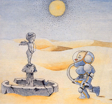 あ~あ、この街もいい街だったのに、ここんとこの温暖化現象ですっかり砂漠だよ。と、そんな感情にふけってる場合じゃないや。この『セルフ・スーツ』の性能実験のために歩いてるんだっけ。まったくうちの会社は人使いが荒いんだから。しかし、いくら「最新医学でも保証された安全性の高い水と食料を供給」と言われたって、原料が原料だからナァ。こんなの買う消費者がいるのかね。あれ?なんだぁ!このしょんべん小僧、『セルフスーツ』なしで自給自足してるぞ。こりゃあ、強敵だ。すぐ部長に報告しなきゃ。
