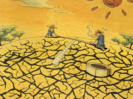 「あ~こう暑いと、海で泳ぎたくなるなア。」「何いうてんねん。温暖化現象で今海そのものが超貴重なんやから。よっぽど金持ちのプライベートビーチにでも行かんと海なんか見ることもできへんわ。」「どっちにしても酸性が強すぎて泳ぐンはムリやしな。」「ま、あきらめるんやな。そやけど、こうして毎日延々とテープ貼ってるけど、こんなことしてここ何に使うんや。」「知らんのんか?ここもともと琵琶湖やったやろ。水ためて、また遊覧船浮かべるらしいで。泳げんでも遊べるしな。」「人間てどこまでいってもホンマに、……商魂たくましナ。」