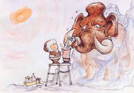 いやあ気の毒だねえ。せっかく目が覚めたらこの暑さだもんねぇ。今?うん、日本の季節は秋だけど。でもあそこの国も土地が狭いからなあ。この温暖化で全部干あがってんじゃないの。ん?一度京都見物したかったって?舞妓さんにも会いたかった?閉じこめられてた割にはよくそんなこと知ってるな。そんなことより、自分の心配しなきゃ。ボクのこの格好見てよ。皮膚ガン予防の高級紫外線カットウェアだよ。アンタも早くこの暑さに慣れて稼がなきゃ。え?どこでって?今やアラスカのこの氷は石油より価値があるからね。その格好のままアメリカまで歩いてって、売ってくるってのは