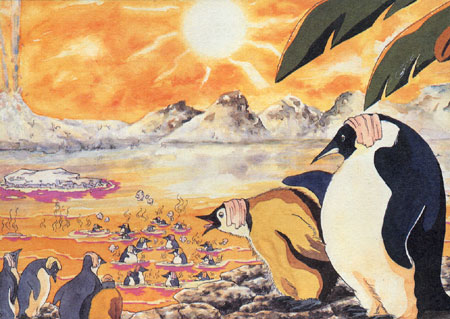 「ねえオカーサン。どうして僕達だけ温泉に入んないの。みんなみたいに汗流そうよ。」「でもねえ。あんたは知らないだろうけど、この温泉地は昔、氷山だったのよ。」「うん、だから?」「これは地球が汚れた証拠なのよ。温暖化でこんなに暑い南極になっちゃって。」「だから余計に今のうちに楽しまなきゃ損じゃないか。そのうち干上がってなくなっちゃうよ。」「そうやって反省もしないで目先の欲求ばかり追ってるんじゃ人間達と同じよ。」「だって僕達が考えたってしょーがないもん。じゃあね。」「あっ!これ!」ザブーン。