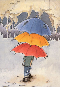 どうして女の子は、こう疑り深いんだ? 「私のこと愛してる?」って聞くから「うん」って答えたんじゃないか。そしたら彼女の台詞が「じゃあ、その証拠を見せて」だもの。昔の男は良かったなあ。黙ってることが美徳で、ダンディを貫けたよなあ。なのに俺ときたら「私を愛してるなら、エリアDに行って見せて」って言われてノコノコこんなとこ歩いてる。エリアDっていやあ、世界中の産業廃棄物を処理してて、降水率が年中100%のとこだよ。しかも、酸性105%以上。「大丈夫、特注の傘あげるわよ」ってなんの慰めにもなんないよ。ウワッ! いよいよ降ってきた! これじゃ人間マリネだよ。たすけてくれ~。