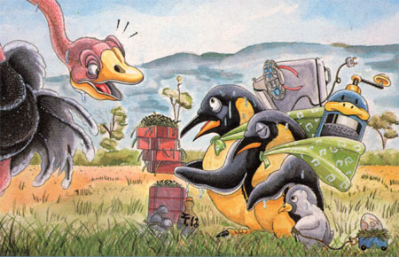 「ああ、南極からお越しのペンギンさんごー家やね。仲介のヘラジカさんからお話はうかがってます。ご挨拶?そんなよろしいのに、マアご丁寧に。そうですか。いえ、ここだけの話、地球が温こうなって北極ぐまさんやらトドさんやら、端の方から移転して来はる方は多いんどすけど、ご挨拶で戴くもんに肉気が多て。ウチらダチョウは草食ですやろ。食べられしませんの。やっぱりー緒に共存していく言わはるんやったら、お互いの食生活くらい知っててもらわんと。いやホンマ、おいしそうなおソバ。まあ、同じ飛ばへん鳥同士、仲良うして。え?いや、そんな催促したみたいでイヤやわ。そうですか、ほなら」(…。)