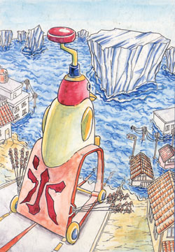 な~に大丈夫。私とてダテに村長を20年もやっとらん。そりゃ君、いくら相手が氷でも周辺への影響を考えれば、むやみやたらに爆破するワケにもいかんだろ。そこで、隣町の造船工場が空いているのを幸いに、造ってもらったのがこれだよ。こいつでガーッ!と削ってしまえばすぐ無くなるさ。しかし大型台風による流れ氷山の数はここ数年増えてはいたが、これほど大量に一気に来るとはな。暖かい地球から南極大陸が消えて十数年。行き場所のない氷山も考えてみれば哀れなもんだ。しかし私たち人間にも生活があるからな。よーし!そのまま慎重に行こう!OK!そこだ! さて、と。シロップはやっぱりイチゴかな?