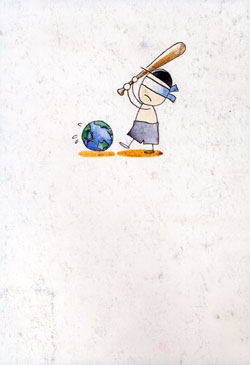 さ~て、番組も佳境に入ってまいりました! ここまで順調に難関をクリアし続けているチャレンジャーですが、さすがに疲れが見えなじめたか、やや足もとがふらついている様子。伝説の故郷“太陽系”への旅をかけ、ご家族のためにも是非ここはふんばって欲しいところ。さあ、地球型バルーンに近づいた! はるか昔、我々の先祖が母なる星と呼んだこの星も今はデータ上で面影をしのぶのみ。急激な環境変化に、地球自ら大爆発したのはもう数百年も前のこと。今振り下ろされようとしているその棒が、いわば神の怒りの再現か! この一撃が決まれば、チャレンジャーの優勝です!! さあ、行け~!! 「ばこっ!」