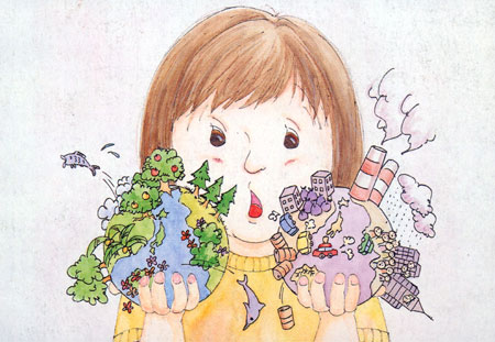 おもちゃに地球の末路が見える。好みはどちら? おっ!出ました1等賞!お嬢ちゃん。商店街歳末福引きセール初日に1等賞を引くなんて、小学生ながら将来有望だ。それじゃ、こいつが商品の地球シミュレーションゲーム。流行ってるから遊び方知ってるね。スピードと便利さを追求したいなら、進化速度を2倍にして早く人類を登場させる。そのうち化学製品を生産しだせば、たいがいのものはミニチュアながら手にはいるってわけだ。ただし10日程度で地球はダメになるけどね。で、もうひとつの遊び方は人類を進化から外してしまう方法。眺めるだけだけど、自然連鎖が崩れない限り半永久的に壊れないよ。ま、ここに説明書が付いてるから、お嬢さんの好きなほうで遊びな。さて、次の方どうぞ!!