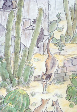 ただいまぁ。なあに、その顔。今日もまたネズミかって? 僕たちも一度でいいからハンバーグや刺身みたいなごちそうを食べてみたい? そんなこと誰に聞いたの? 黒猫のおじいさんが昔はいくらでも食べられたって言ってたって? もう、余計なことを…。あのね、それは人間がいた頃の話なの。そういう贅沢や便利さを求め過ぎた人間のせいで地球はこんな砂とサボテンだけの星になってしまったし、人間自身も環境に順応できずに滅びてしまった。だから私たち猫族は、野生を失わずに堂々と生きていかなきゃいけないっていつも言ってるでしょ。お母さんが毎日どんなに苦労して獲物を捕って来てるか考えれば…こら! 食べてないで聞きなさいってば!