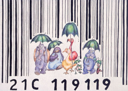 「なぁ象さん。いくら最近の雨がますます汚れて、黒い上に降り方も乱れてるいうても、それをバーコードとやらにみたてて人間に救急信号を送ろうっちゅうのは無茶とちゃうか。アタシらカエル族は長いこと人間の近くに住んでたさかい知ってるけど、そら人間ちゅうのは自分勝手な動物やさかいな」「そやからですよ。バーコードいうのは今や人間の生活にすっかり浸透してる記号みたいなもんです。わしらはせいぜいこれくらいしか文字を書かれませんけど、これ見た人間の中には、なんぞ買える物やろか思て近付いてくるのもありますやろ。その時にみんなでこれの意味、訴えようやないですか。今やったら間に合うさかい、一緒に地球のこと救ってくれて!!」
