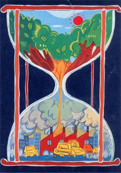 アカン!神さん、はよ帰ってきてぇな。この地球いう星、むちゃくちゃ緑の消費早いがな。わしも長いこと星の寿命はかってるけど、こんな星初めてや。たいがい自己浄化するのにえぇ条件揃えときながら、なんでこない緑が減るねん。ははぁ、やっぱり人間がバランス崩してんのやな。そやし人間はあかんて言うたのに、神さん、自分と同じ姿やからつい甘い顔してしもたなぁ。でももう、そんな悠長なこと言うておれん。最後の緑が落ちたら、この星二度と復活せえへん。。なんや、わしの下半身もジワジワ熱ぅなってるし。こら神さんの帰り待っとれんわ。自力で、ウンショ!ひっくり返ったる!こけて割れたら、人間さん恨みまっせぇ!