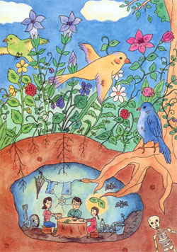 「早いものだねぇ。ここで暮らしてもう10年か。いよいよ明日は久々に地上の空気が吸えるな」「あたし初めてだし、ドキドキする。地上ってすごく眩しいんでしょ?」「そうねぇ。あなたはここで生まれたんですものね。あの頃の地上は汚れきっていたけど、こうして人間が地下生活を送るようになって、少しずつでもきれいになってるはずよ。人間が外に出られるのは、10年に一度1日だけっていう規律を守っているから」「昔の人間てそんなに悪かったの?」「便利さを追求しすぎたんだ。大事なのはみんなで、バランスよく仲良く生きてゆくことだって気付くのに、時間がかかったんだね。さ、明日は早いからもう寝ような」
