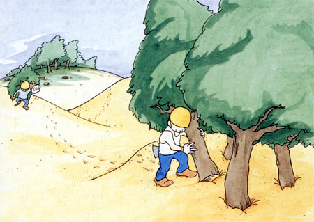 「じゃぁ、今日のノルマはその1本で最後だ。まぁ、この分なら今月末には全部の木の移動が完了しそうだな」「そうですね。明日は休み明けの社員も出てきますし、1台ですが運搬車両も手配しときましたから」「そうか。森林移動の完了日は厳守だからなぁ。何でもこの国の偉いさん、国連から国土全体の緑地の航空写真を提出しろと言われて、慌てたらしいよ。何しろ地球条例で定められた緑地面積の10分の1もないんだから。そこでこうして森林を移動させながら、色んな場所で写真を撮影してるのさ」「開発による伐採と酸性雨、それから温暖化に紫外線。地球上のほとんどの国は丸坊主だと思うんですがね」「建前ってのがあるんだろ。さ、帰ろうぜ!」