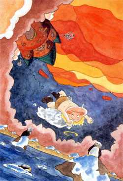 勇んで出はったわりには、早いご帰還ですなぁ。「オゾンホール突き抜けて、宇宙へ飛び出すんや~!」言うてここ出発しはってから、まだ1時間もたってしまへんで。えらい真っ黒クロスケになってしもうて、おじいさんからもらわはったご自慢のマント、見てみなはれ。ボロボロのススだらけですがな。いくらおじいさんがスーパーマンとか言う人でも、あんたはんは凡人でっしゃろ。形だけ真似てもあきまへんて。上へ行くほど、モノ凄い紫外線ですさかい。そんな自分だけ地球からおさらばするようなセコイ根性では、ヒーローの血が泣きまっせ。とりあえず、あてらペンギンと一緒に、この南極の水で頭冷やしなはれ。もう大分ぬるうおますけどな!