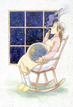 明日はやっと、バーチャル妊娠最終日かぁ。1カ月とはいえ長かったよなぁ。昔の女性はよくこんなお腹かかえて何カ月も生活してたね。小遣い稼ぎにと思って参加した政府のモニターだけど、こりゃ制度化して欲しくないね。確かに今や妊娠とは名ばかりで、実際の子供はカプセル子宮から機械的に生まれるよ。だからって形だけでも妊娠しないと母性が育たないっていうのはネェ。便利に合理的にしといて、何か不都合があるとどっかで帳尻あわせようっていうのはどうかと思うけど。せっかくきれいだった地球、そうして住めなくしちゃったんだよね。どうでもいいけど「母なる地球」とやらを、私らのお腹ん中に求めるのやめてよね。もう真っ黒だけどさ。