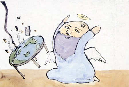だぁ!! またダメじゃ! 何回シミュレーションしても、人間が出てくると星の寿命が極端に短くなるわい。地球には思い切って見切りをつけたことだし、そろそろ新しく生命体のいる星を創っときたいんじゃが…。やはり人間はやめとくか。あれだけ美しく、しかも安定した地球を壊してしまうんじゃから、人間ちゅうのはまったく…。いや、もとはと言えば、人間もわしが創ったものじゃったな。アダムとイブの二人でやめとけば良かったかのう。うむ!過ちは繰り返してはならん。さて、どうするかな。とりあえず、試しに「猿の惑星」ぐらいでいっとくかな。なんかどっかで聞いた気もするが…。まぁ、人間がはびこるよりはマシじゃろ。決定!