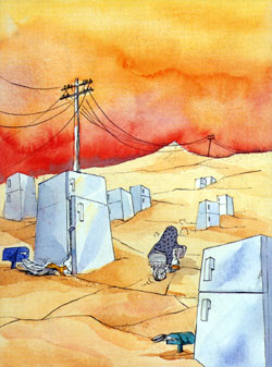 号外、号外~!って、普通こういうのはお客の方から飛びついて持っていくモンじゃねえか? なんだって一軒一軒配んなきゃなんねえんだよ。人間が南極を砂漠化したお詫びにってんで、電気と冷蔵庫を置いてってから、み~んな引きこもりになっちまってよ。ペンギンてえのは尻つきあわして生活していくもんじゃねえか!! だいたいこれ、中古のフロンガス使用冷蔵庫だよ。壊れたらどうすんだ? 解体しながらフロンガスまき散らかして、またオゾンホール成長に一役買おうってのかよ! あ~、怒りながら走ると余計暑い。ちくしょう!なんだって新聞屋の息子になんか生まれちまったのかなあ。ほい、号外だよ!「最後の人類、ついに地球を去る」だってよ!