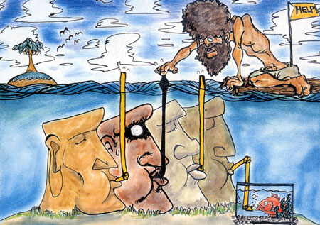「やれやれ、いったいここはどこなのじゃ?地球人最後の日と言われたあの空前の大洪水から何日たったのやら。まったくそのあおりを喰って、我々までこんな遠くの海域まで連れてこられて、しかも海底に沈んだままで、不便この上ないわい。のう兄じゃ達」「まあ、そうぼやくな弟よ。こうして兄弟4人が同じところに流れ着いただけでも、ありがたいと思わねば。それに人間も悪いところばかりではない。一部ではあるが我々の故郷であるイースター島を復旧整備してくれたしのう。それに間に合わなかったとはいえ、地球環境問題にも取り組んどった」「でもやっぱり人間はろくなことせんよ。こら!そこの漂流者。好奇心でつっつくな。バカもん!フゴフゴフゴ」