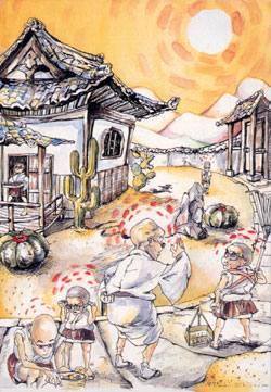 やだなあ。また和尚さんのお説教が始まっちゃったよ。長いししつこいんだよね。和尚さん、庭掃除の出来にうるさいからなあ。で、俺たちが「暑いです」って言うと、最後には「心頭滅却すれば火もまた涼し」の一言。そりゃあそうですけどね。でも和尚さんが小僧だった頃と時代が違うんですって。どう考えても和尚さんの言う「潤いのある庭」は無理。こんだけ連日連夜、雨の一滴も降らずに気温ばかり上がり続けて、とうとう明日で丸2年。俺がこの寺に修行に来て雨を見たの1回だけなんだから。昔は四季があって、雨続きの日や寒い日まであったっていうんだから信じられないよね。あ~、愚痴ってないで、やっちゃうかな。でも今晩のおかずもサボテンなのかなあ…。