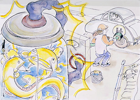 いらっしゃいませ!いらっしゃいませ!ここが今、巷で話題の「NAMA・ZOOM」エネルギースタンドでございます。ごらんのとおり、我が社がお客様にご提供いたしますのは、電気ナマズ100パーセントのエネルギー。え?そんなもので車が走るのかですって?ご安心ください。我が社が開発したこの水槽には特殊な磁極を備え付けておりまして、本来は餌を獲るときにだけ排出されるナマズの電気を、常に蓄えておくことができるのです。その電気をさらに濃縮して・・・いやいや、これ以上は企業秘密です。とにかく、走っていただければわかります。今なら先着2000名様に「手元で発電、便利なペット」電気ウナギを1匹差し上げます。さあ、どうぞ!いらっしゃいませ~!