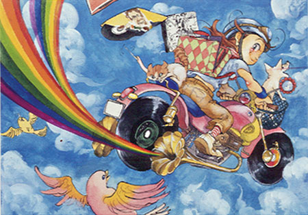 Kyotoのみなさ~ん!お元気ですか~! 虹色娘のナンシーが、5カ月振りに鴨川の空に帰ってまいりました。ほんのり染まった桜の並木を見下ろしながら、ただいま今出川通りを越えて北上中です。お部屋で、職場で、車の中でラジオを聴いてるリスナーのみなさんは窓を開けてみてね。いつものとおり、長~い虹のリボンが目印です。素敵な曲をバンバン流して、京都の空をハッピーにしちゃうからお楽しみに。でもここまで来ると空気も澄んで気持ちいいね。やっぱり人と車が多いと、どうしても空気が汚れちゃうしね。だからナンシーは世界中を回って、みんなに空を見上げてもらって、その大切さに気づいてもらうきっかけを作ってるのさ! さ~てまずは1曲目、いっちゃうよ~!