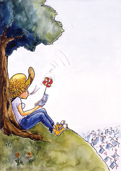 う~ん。ここまで登ればそれなりに風が吹いてると思ったんだけど、今日はだめだわ。凪っちゃってて、ちっとも風車がまわりゃしない。下の家やビルの風車も止まってるもんね。しょうがない、自力で充電するかな。せ~の!フー!フー!フー!フー!フー!フー!あ~、何とか反応するようになったかな。それにしても、世の中便利になったんだか何だかわかんないわよね。ケータイ使いたさに、こんな山にまで登って、おまけに過呼吸になりそうなほど風車まわして。何やってるんだろ。ここに立ってる木に比べたら、自由になる手足も口も目も耳もあるのにさ。私達、コミュニケーションの仕方、忘れちゃってるよね…。ん?メールだ。あ、ナツミからだ。返信返信っと…。