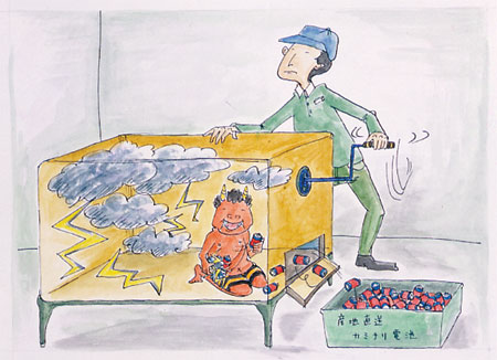 うれしいのう、うれしいのう。わしのような年寄りのカミナリでも役に立つというてくれるんじゃから。こうしてこの小さい器に電気を詰めていけばいいんじゃろ。いやいや、わしも若い頃は低気圧に乗って太平洋上を駆け回ったもんだがな。最近は腰が痛うて思うように太鼓も打てんし、稲妻も地上まで届かんし。女房子供の前でもなんや肩身が狭ぅて辛かったが、思い切って人間界の「エネルギー提供者募集」に申し込んでみて良かったわいな。雲上の家で粗大ゴミ扱いされることを思えば、どんなに毎日張り合いがあるか! 一昔前は「地震カミナリ火事オヤジ」といえば怖いものの代名詞だったが…、見たところ、最近は人間のオヤジもたいして怖がられてなさそうじゃの~。