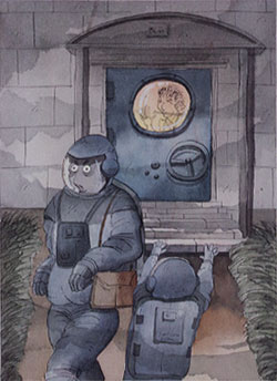 「いってきま~す! ねぇ、お父さん。今日はスモッグ予報当たったね。すごく晴れてるね」「本当だな。ヘッドライトなしで歩けるんだから」「いつもは大通りまで手をつないでても怖いくらいだもんね。ねぇ、今日ならこのエアキープ・スーツ脱いで遊んでも大丈夫じゃない?」「だめだめ! どんなことがあっても外でそれを脱いじゃダメだよ! このスモッグを吸い込んだら1分と経たない間に死んでしまうんだからね。ちゃんと学校に着いて、シェルターの中に入ってから脱ぐんだよ!」「はぁい…」「ほら、今日は参観日だから、お母さんが学校に来るんだろ。しゃんとして」「うん! お母さんね、参観日用に新しいエアキープ・スーツ買ったって言ってたよ。ピンク色だって!」「…聞いてないぞ」