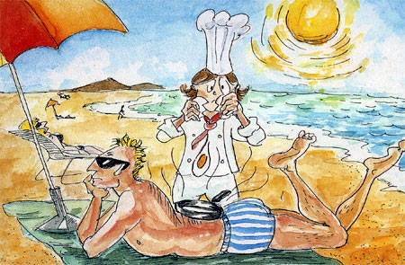 ど~してコックの採用試験が浜辺であるのかと思ったら、なるほど、こういうことね。すっごいヒューマンなコンロだこと…。すいません、お願いしまっす。うわ~、みごとに真っ赤っかな背中。じゃあ、フライパンのせま~す。おお!熱くなってきたよ。そこへ油をひいて…玉子を落とすと…おお!焼けてるよ。って、いちいち感心してる場合じゃないな。早く作んなきゃ。しかし、太陽熱ってすばらしいよね。うちの庭でバーベキューする時も、次からこの方法でいくかな。さて、いい具合に半熟になったところで塩・コショーで…完成っと!できました~!…え?違うって何が?レストランのコンロはこっちの台の?この人は…観光の方?あら~失礼しました。私…不採用?ですよね~。ははは。