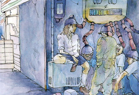 「俺さ、明日の晩からここに来られへんかもしれへん。っつーか、来ぃひん」「なんでや。新しい彼女んちにでも呼ばれてんのんか?それか、ここよりいい儲け話があるんやったら、教えていけや」「そんなんとちゃうて」「じゃ、なんや」「俺ら、半年程前からこのコンビニに集まってて、ほんで何かここの店長にうまいこと言われて、頭にこんなんつけたまま喋っとるやろ」「俺らの中の、ありあまってるエネルギーを店で使うってことでやろ。そんでそれに見合う代金くれとるんやさかい、何も文句あらへんやろ」「それが何か気持ち悪いんや。そんなん、売るもんとちゃういうか…」「えらい真面目なこと考えとるやん」「そおや。この機械のせいで頭が冷えたんかもしれん。とにかくやめる!前向いて行くんや!じゃあな!」