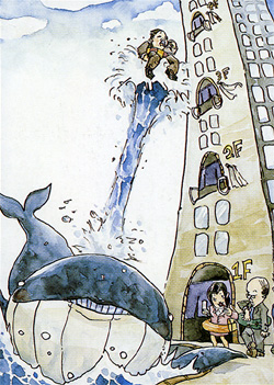 「いかがです、社長。この『ホエールエレベーター』の調子は。地球環境配慮・コスト削減・迅速出動・無遅刻 無欠勤!どれをとりましても御社のお役に立たないところは無いかと存じますが」「まあ、少々上げ方に勢いが ありすぎて、ムチ打ちになる社員もいるそうだが…。我が社のように自社ビルの階数が多いと、上階まで上げて もらえる自然エネルギーは限られているのでな。あまり贅沢は言えんよ」「前回お試しいただきました『タコ仕様』 でしたら、比較的穏やかな昇降ですし、一度に8人運べますが…」「あれはイカン。仕事に熱が入るとそこらじゅ う墨を吐きおって、大切なお客様との取引がぶち壊しだったからな」「では、引き続きこの鯨のままで」「うむ。 鯨(ゲイ)は身を助く、と言うしな」