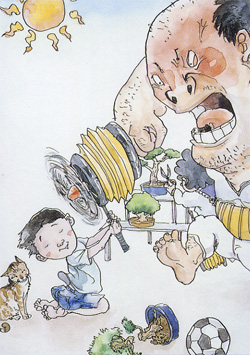 いいかげんにしやがれ、この野郎!このクソ暑い時に何回イライラさせやがるんだ!おまけに人が腹の底から怒ってる前で、心底涼しそうにしやがって。だいたい何だぁ?そのけったいな機械は。おまえ、学校で何を習ってきてやがる。「身近にあるエネルギー」が宿題だ?つまんないことを習ってくるんじゃねえ!ちんたらちんたら生きてたら、人間が小さくならぁ!だいたい人様の力で自分だけ楽しようって、その根性が気にくわねぇ。てめぇ自身が汗水たらして、親兄弟を楽させろってんだ。カカァまで、何やってるんだ!子供の浅知恵に乗っかるようなことするな!まったくどうなってんだ。どいつもこいつも。頭と顔から湯気が出そうだぜ…。バカヤロウ!人の頭の上で湯を沸かそうとするんじゃねえ!