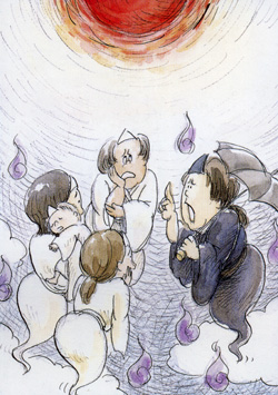 あ~、だめだめ。そんな格好で裟婆に戻ったりしたら、あっという間に紫外線で真っ黒になっちゃうわよ。え~と、AVじゃなくって、UVカットとかいうのをしっかりしていかなくちゃ。私もね、三十三回忌からこっち、あんまりあっちに行ってなかったから知らなかったけど、この五十回忌に呼ばれて、まぁびっくりしたわよ。お天道様のお恵みも、あんだけきついとどうかと思うわね。まあ、お天道様のせいじゃないんだけどさ。人間でいる間は、目先のことしか見えないでしょ。老若男女、寄ってたかって裟婆の環境を悪くしちゃったんだよねぇ。孫や曾孫の悪口は言いたかないけど、あれじゃあ、まさしくこっちは極楽だわよ。とにかく、お盆に帰るんなら着替えて行きなさいよ。特に三途の川周辺は日陰がないからねぇ。