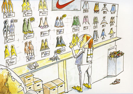 「ねぇ、あのお客さんて、朝からずっと選んでない?レディース用のフィンの前で、何をそんなに悩んでんだろ?」「それがさあ、最初にそこのコーナーに立ってたときに、『サイズはいくつですか?』つて尋ねたのよね。それが、どうも要領を得ないのよねぇ。好みもあやふやだし」「あっ、わかった!ホワイトデーの下見じゃないの?」 「え~、まだだいぶ先だよ。第-、言っちゃあ悪いけど、あの人がチョコをもらえるとは思えないけど」「ちょうどいいじゃん。あんたが義理チョコあげてさ、かわりにお店で一番高いフィンを買ってもらえば、店の売上になるし、新しいフィンは手に入るし、一石二鳥よ!」「そういうのって、足元を見るって言うんじゃないの…?」 「足見ないと、サイズ測れないもん」「そうじゃなくって!」