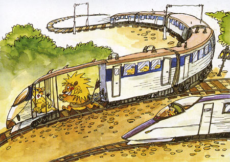 ご案内いたします。当車両は、予定時刻どおり、まもなく京都に到着いたします。GW最終日ということで車内が大変混雑いたしましたこと、またメスライオンのメイクのため、発車時刻が遅れましたことを、心よりお詫び申しあげます。なお、ホームに停車いたしましてからも、係員の指示に従って安全を確保の上、順序良くお降りください。慌てて出られますと、オスライオンのスタミナ源となる恐れがございますので、ご注意ください。最後に、当電鉄ではさらなるエコ車両開発のため、ただいま「人力」を募集しております。システムはこの車両と同じです。我こそはと思われる方々のご応募をお待ちしております。本日も3L(ラブ・ラブ・ライオンレール)をご利用いただきまして、誠にありがとうございました。京都ぉ、京都でございま~す。