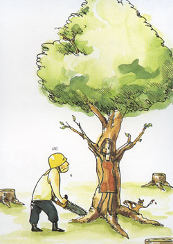 「聞いたで。伐採作業、中途半端に終わらせてきて、主任に怒られたらしいな」「残したいうても、一本やけどな…」「そないデカイ木か?」「そやない。その木にな、女の全身像が描いてあってな、じ~っと、こっちを見てたんや」「そんなん誰かのイタズラやろ。気にしてたらあかんがな」「主任にもそう言われたんやけどな…その顔が、似てるんねん」「誰に?」「おまえも知ってるやろ。学生の時に付きおうてたコや。結局、別れてしもたけど、えぇコやったんや。やさしゅうて、スタイルよぉて…」「そんなん、そのコかて今は普通のおばはんになってるがな。がめつぅて、肥えてて、口のうるさい…」「エライひどいこと言うなぁ。そんなんわからへんやろ」「わかる」「なんでや」「そのコが、今のオレの嫁はんや」「…!」
