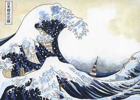 エリカ、今日こそはキミを振り向かせてみせるぜ。キミは今まで、オレのメールや電話、手紙まで「暑苦しい!」と無視し続けて来たけど、これはきっと目をそらせられないはずだ。見てくれ!この力作を!キミへの愛を一枚の素晴らしい絵画で表現した、何て罪作りな、溢れ出るオレの才能。そう、これは南極の氷をも溶かす、地球温暖化をも上回るオレの熱い熱い想いだ。東京を、名古屋を、福岡を、そして京都や琵琶湖まで呑み込む、天に達するが如く巨大化した波頭に、人々は敬意と賞賛を送るだろう。そしてそれはやがて、オレとキミへの祝福のエールとなり、新たな波を生むに違いない…。なんて素晴らしい未来!え?わけがわかんない?いや、あっ、待って。エリカ、行かないでくれ~!プリーズ、カム・バック…!
