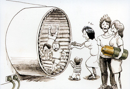 そうそう。うちもいよいよ3年生やからねぇ。本気で私立中学受験するのか、公立に行くのか考えんとあかんのよ。小さいうちから勉強のくせつけとかなあかん思て塾だけは行かせてたんやけど、本人はサッカーやゲームやて、まぁ誘惑によわぁてね。スムースに進学してくれるかどうか、かなりあやしいわ。今日もここへ来たいみたいやったけど、無理やり家に置いて来たんよ。え?また回してくれる子供が減る?そやねぇ。うちはもうリタイヤさせてもらうわ、悪いけど。どこの家も近々そうなってくるんとちゃう。この遊具もだいぶ時代遅れやね。2020年製?そら古いわなぁ。町内に4人しか小学生がいいひん時代なんて予測してへんかったんとちゃう?少子化どころか「無子化」の時代になったら誰が回すんやろな。ペットの犬やろか?