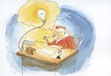 いいから、いいから。ドーンとまかせておきたまえ。君、私をみくびってもらっちゃ困るよ。最近はベストセラーと呼ばれる作品こそ出していないが、まだまだ私のアイデアは尽きることなくこの頭の中にギッシリと詰まっておるのだからして。うむ…。お!今、ちょっといいアイデアが浮かんだぞ!君にも明るいものが見えただろう?私のアイデアはキレが違うからね。あの時代物を専門に書いているなにがしは、こう、ぼ~っとした行灯が浮かぶそうじゃないか。かと思うと、いまどきの若いのは色ばかり派手で、チカチカと落ち着かないからねぇ。アイデアの灯火というのは、品位が現れるものなんだよ。え、時間がない?浮かんだのなら早く書いてくれ?せわしない奴だな。-気に明るくするとだな…ほらほら、あ~ぁ…フィラメントが切れちゃったよ…。