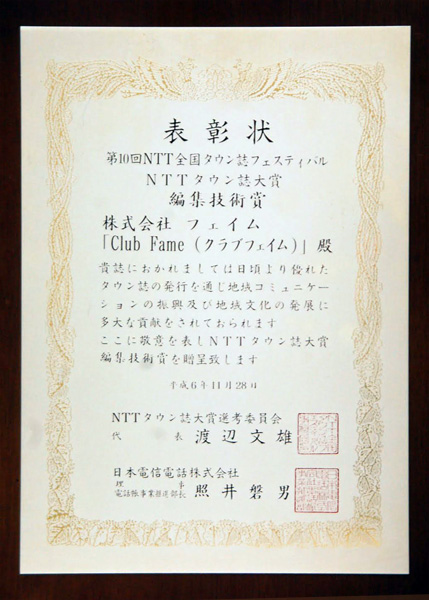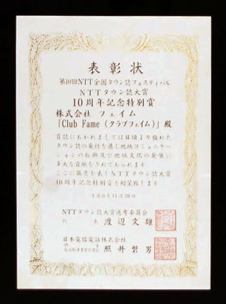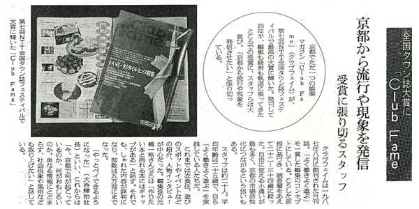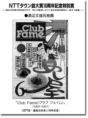京都でただ一つの娯楽マガジン「ClubFame」(クラプフェイム)が、第七回NTT全国タウン誌フェスティバルで最高の大賞に輝いた。