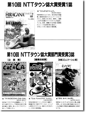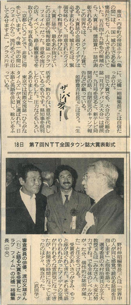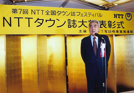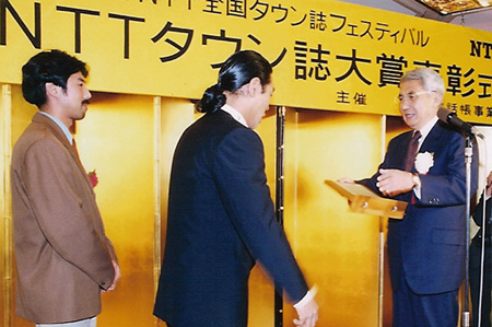 NTT事業部が全国に新聞・テレビで呼びかけ、タウン誌408誌を集め「第1回NTTタウン誌フェスティバル」を開催したのは、昭和60年(1985)であった。選考委員会代表・渡辺文雄さん(俳優)が壇上で第1回NTTタウン誌大賞を授与する様子は、経済成長を果たし、これからは地域の力、タウンメディアが試される時代だよ、と言っているように見える。